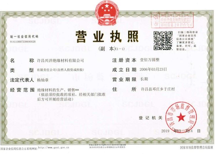 許昌興洋絕緣材料有限公司營業(yè)執(zhí)照